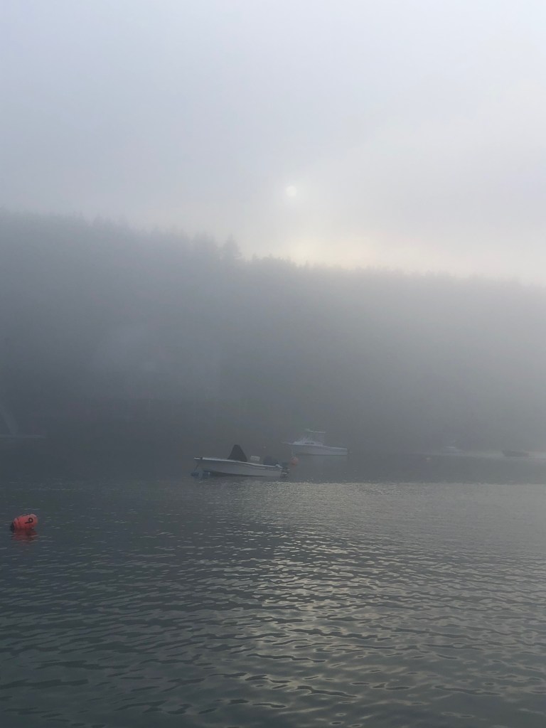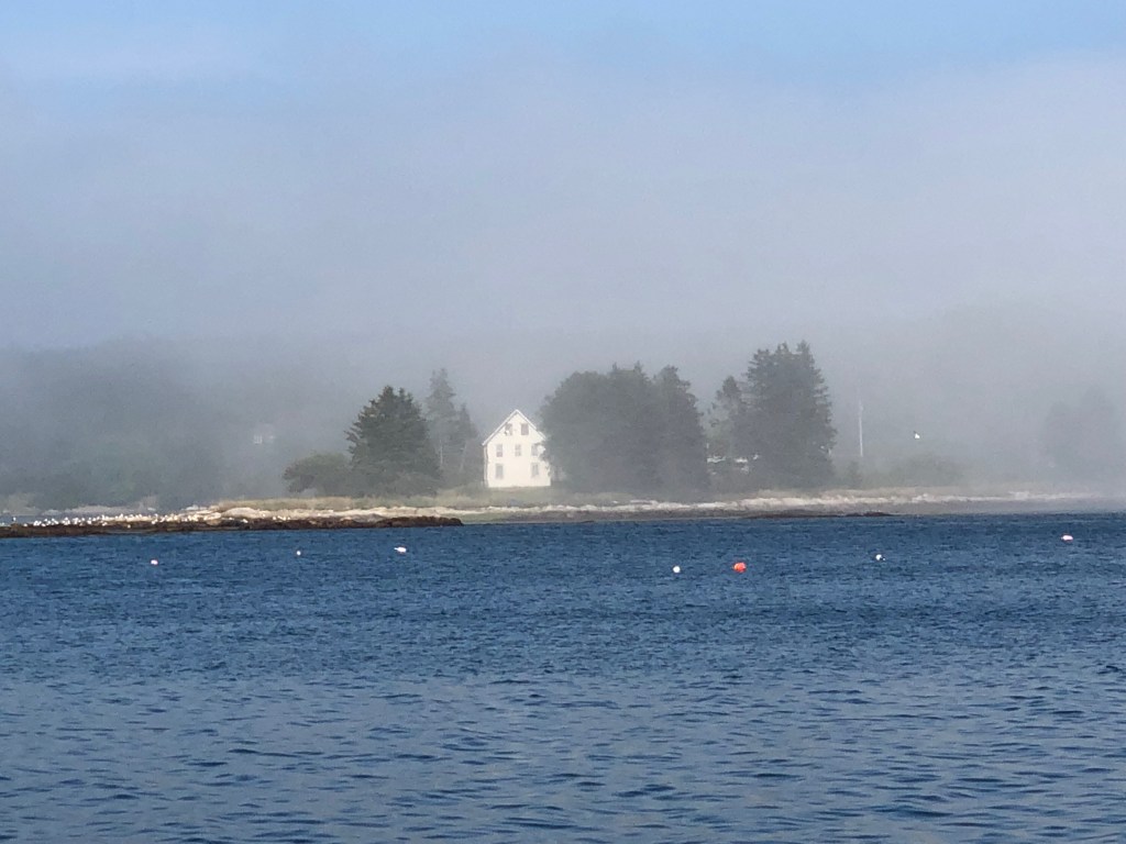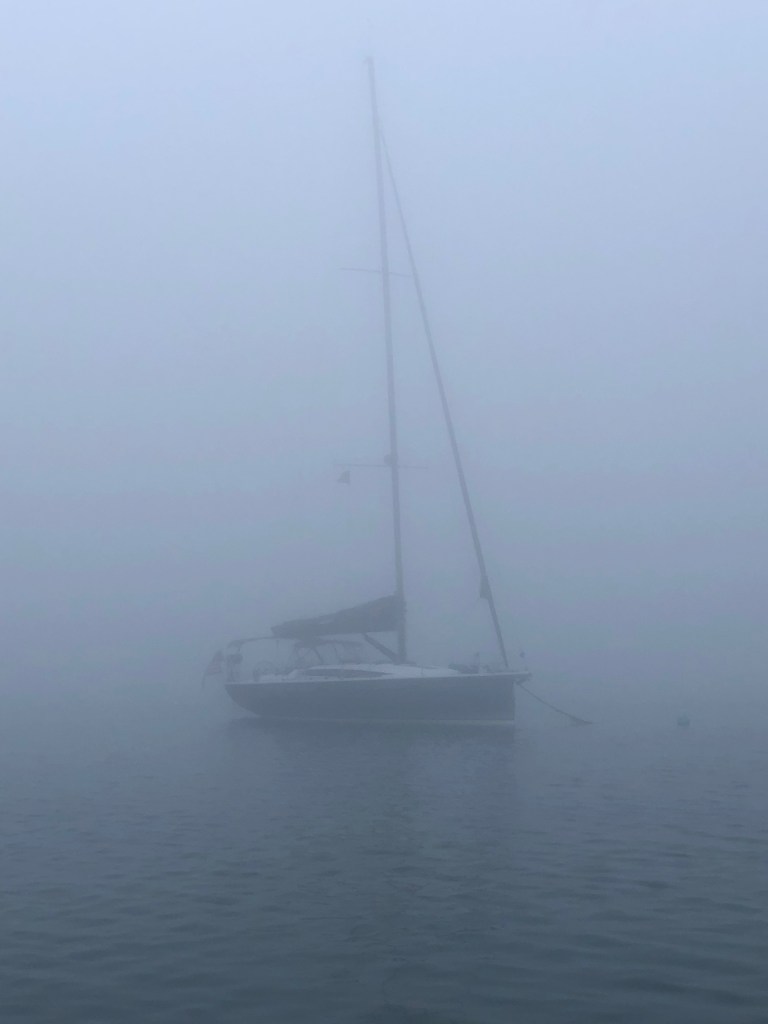 The next day the weather started to go downhill: The fog was thick, the wind was picking up, and storms were forecast overnight. We had a nasty passage, with lobster pots and lobster boats to dodge in the fog, and a building, chilly breeze. We made our way to Seal Bay on Vinalhaven, which is a very protected harbor, and dug our anchor into the thick Maine mud there! It blew hard overnight and we were glad to be somewhere snug.