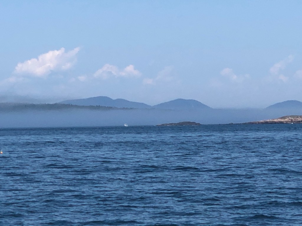 After the cruise broke up, we had hoped to continue east with a goal of reaching lovely remote Roque Island. We were there two years ago and swore not to go back unless there was going to be good weather! However, with fog and strong Southwesterly winds in the forecast, we decided to start working our way south. First stop was Frenchboro, which is known for its lovely harbor, amazing lobster dinners and blueberry pie at Lunts on the waterfront, and lack of visitor moorings. We were excited to find there were several visitor moorings available, but we soon found out why – the moorings are poorly protected and uncomfortable; and sadly, Lunts decided not to open this year. In search of a more comfortable spot, we moved on to Burnt Coat Harbor on Swans Island, and enjoyed dinner on Gannet as the fog moved in and out (mostly in!).