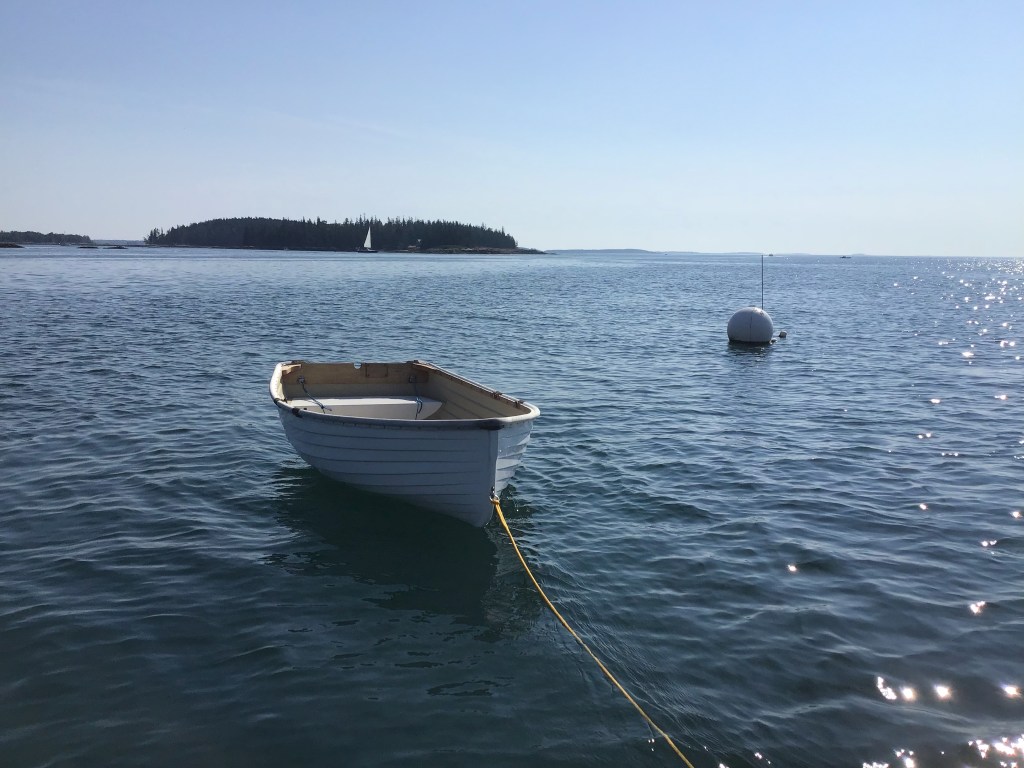 The 19th looked none-too-promising, and I put on a warm sweater and foul weather gear as we left Seal Bay. We were sad not to see it on a sunny day, as there is so much there to explore, but there’s always next year! We made our way through Fox Islands Thoroughfare and out to West Penobscot Bay as the sun came out. At first, we had a nice breeze and sailed along on a close reach, thinking we might get as far as Boothbay. However, the wind came round on the nose, it was hard work dodging all the lobster pots, and we decided to put in to Tenants Harbor. By cocktail hour it was bikini weather! We had thought of buying some lobster for dinner but found the lobster shack was closed – seems to be a theme this summer, and we hope that these small local businesses will be able to recover.