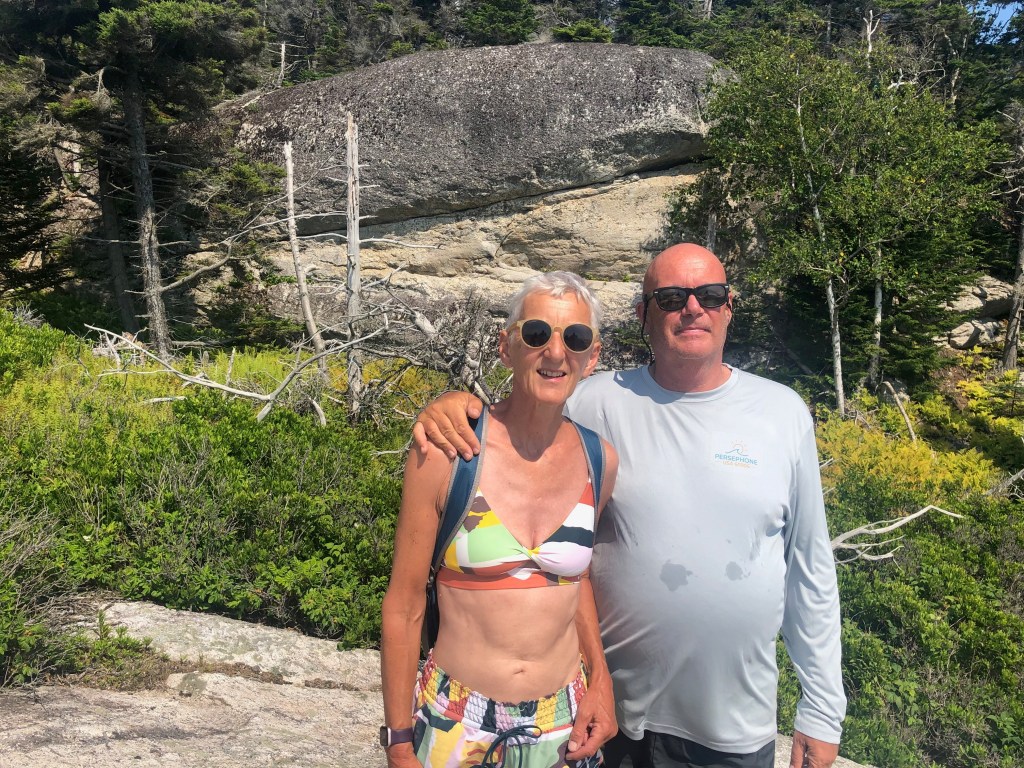 We had thought of sailing straight home from Tenants Harbor, but decided we were in no hurry to go home, so went to Harbor Island in Muscongus Bay instead. The harbor is between two good-sized islands and a series of shoals to the south. I made bread in our solar oven but it was all eaten before I thought to take a photo. I tried again, but the wind blew the solar oven over, and the results were not presentable! Will keep trying….. We enjoyed a good hike on Harbor Island and then dinner (consisting of “whatever is left in the fridge”) with Jack and Dru.