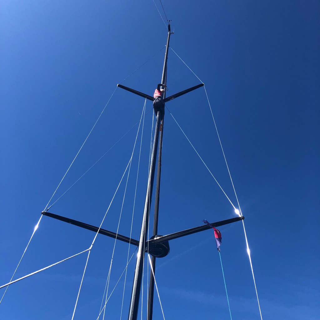 Katie up the mast – thank goodness for electric winches!