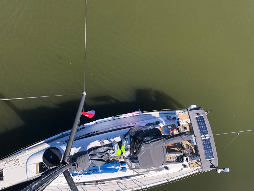 Looking down from the mast – drying everything out and giving the solar panels some love