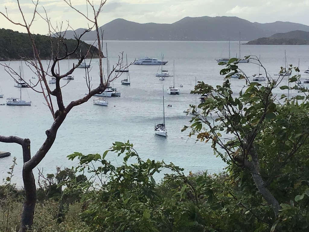 Having completed our trip to Anegada, and with the weather forecast all over the place, we decided to spend a few days in the Channel Islands. First was Cooper Island, where we stayed two nights. This was a complete contrast to the remoteness of Anegada: The mooring field was packed with charter boats full of visitors on either the first or last day of their trip, and either way, intent on having as much fun as possible! The clear water and protection from the wind made this a great spot for swimming and paddle boarding. We also snorkelled around the rocks off Cistern Point and saw some very nice fish. Just under the dinghy tie-up line looked like an aquarium – probably because so many people have been feeding the fish! The coral is still quite small but hopefully is recovering. I swam around a corner and saw first one, then two, then eight huge tarpon lurking in the gloom – I turned around quickly! We had drinks at the Cooper Island Beach Club one night and were lucky enough to score a table for dinner the next night. It gets busy here, and justly so; the food is excellent and much of the veg is grown on the island.