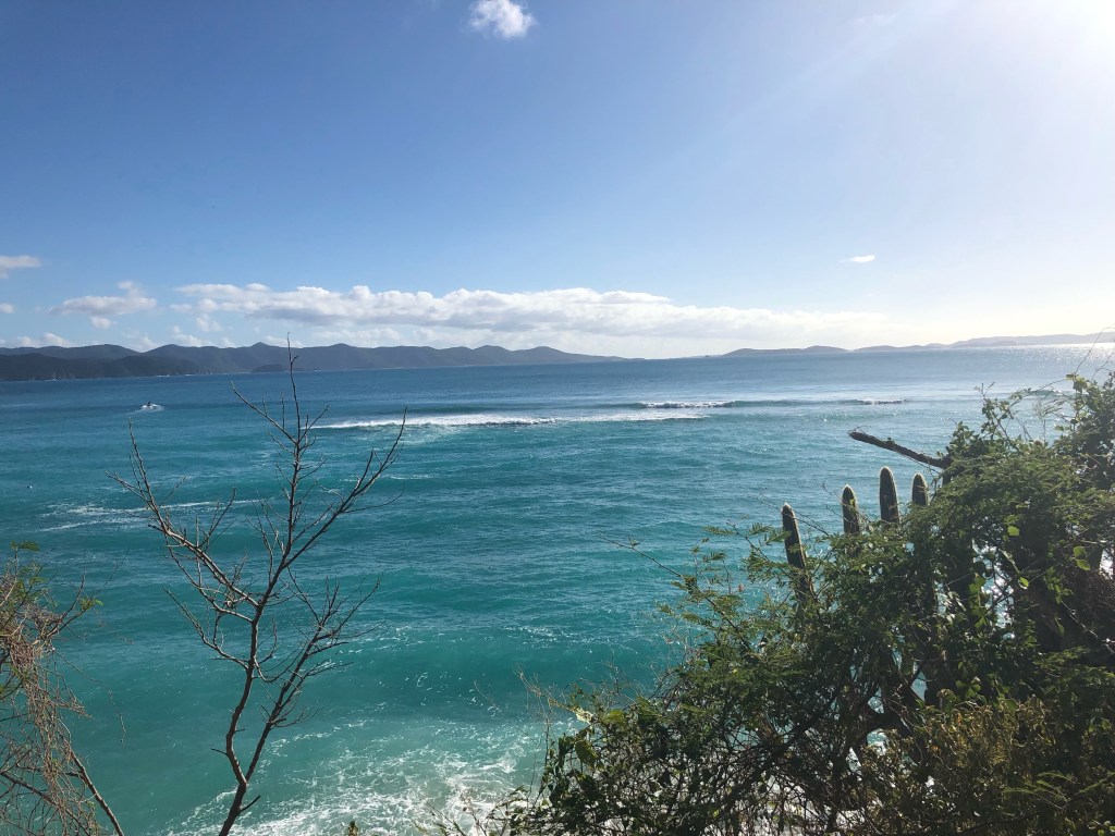 We went into Diamond Cay and went ashore. This was a good spot for paddle boarding and exploring, and for a walk over to the Bubbly Pool. We’ve been to the BVI many times, but only discovered Bubbly Pool on our last trip. This time there were no kids there, meaning that the grown-ups were free to play in the surf created when waves crash between the rocks into the pool! The northerly swells were in our favor as they made the pool that much more fun.