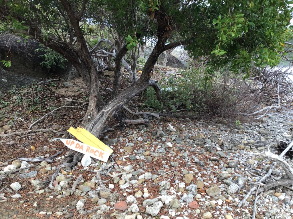 The next day we had a lunch stop at an old favorite, Sandy Spit. I remember taking the kids there when they were tiny, and hiding “pirate treasure” for them to find! We were amazed that the spit is still there as it didn’t look like it would take much to wash it away. It looks like the palm trees were all blown down, but great care is being taken to reestablish them. There were still big swells running so we didn’t land the dinghy, but Anne and I swam ashore for a look.
