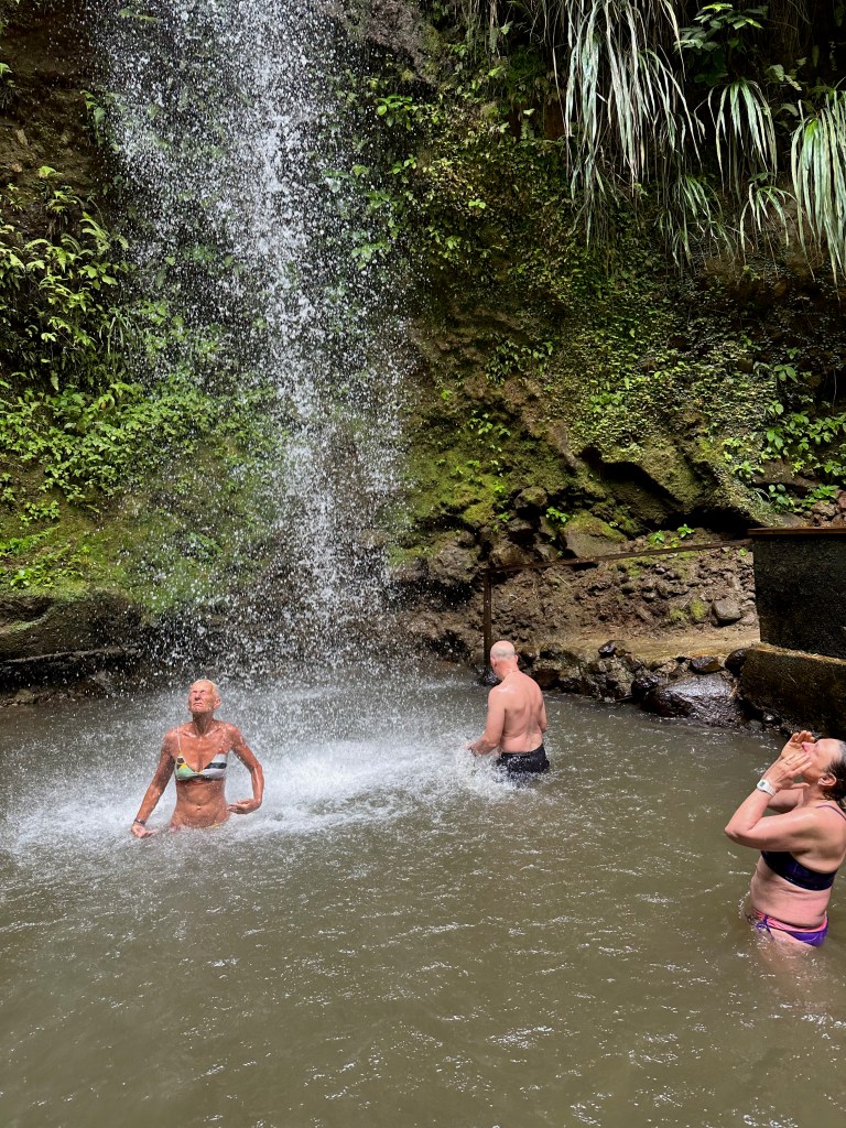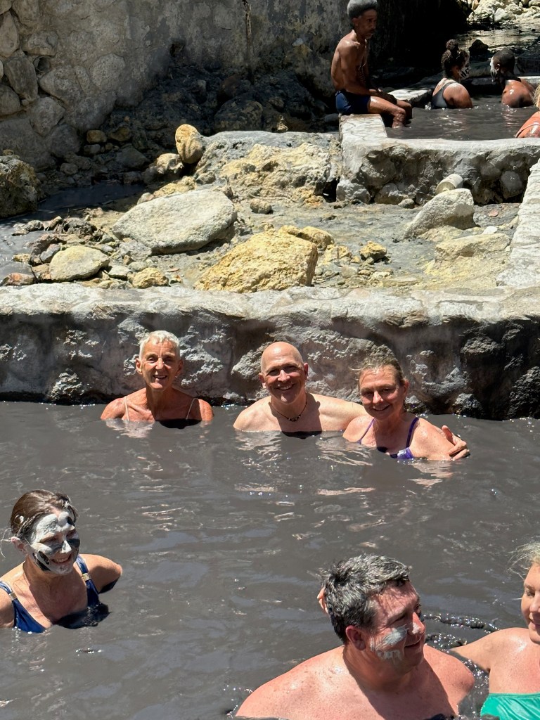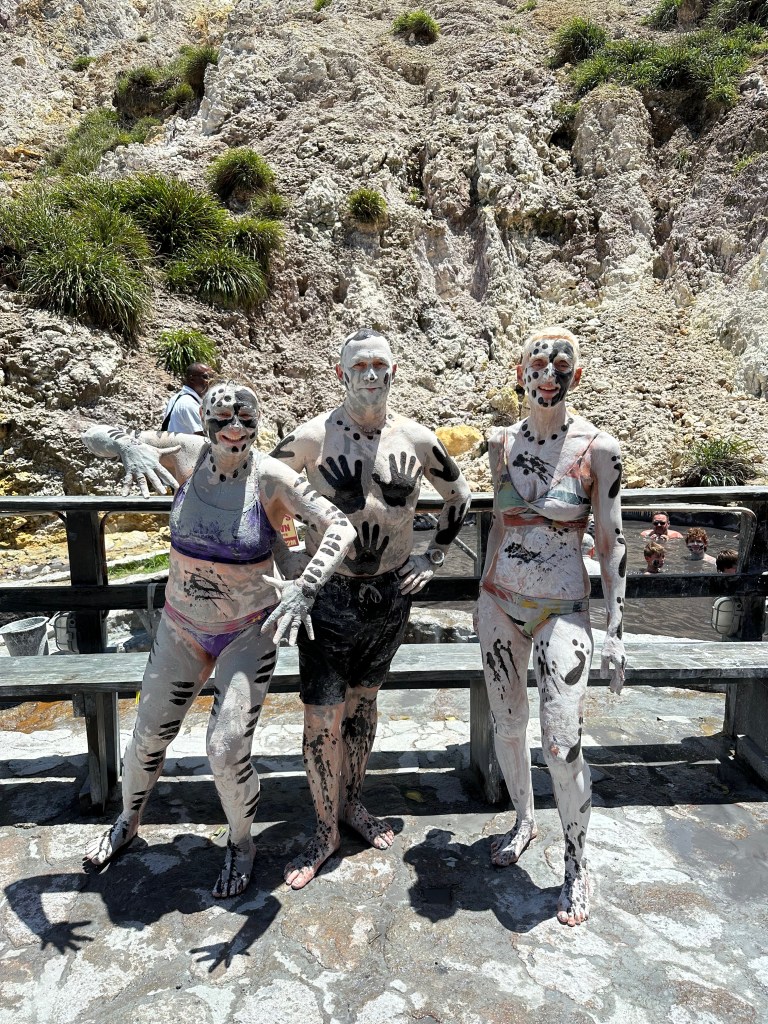 Our next stop was a mud bath! The water is about 100 degrees and runs down from a nearby vent in the volcano. The mud bath was a multi-step process; fortunately our guide held onto our phones so we were able to get photos without getting sediment into the phones.