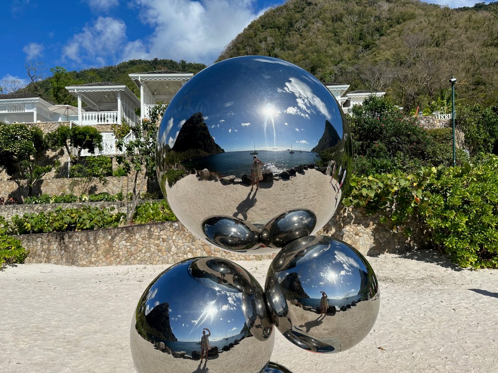 This clever sculpture is about the only way to get a photo of both Les Pitons!