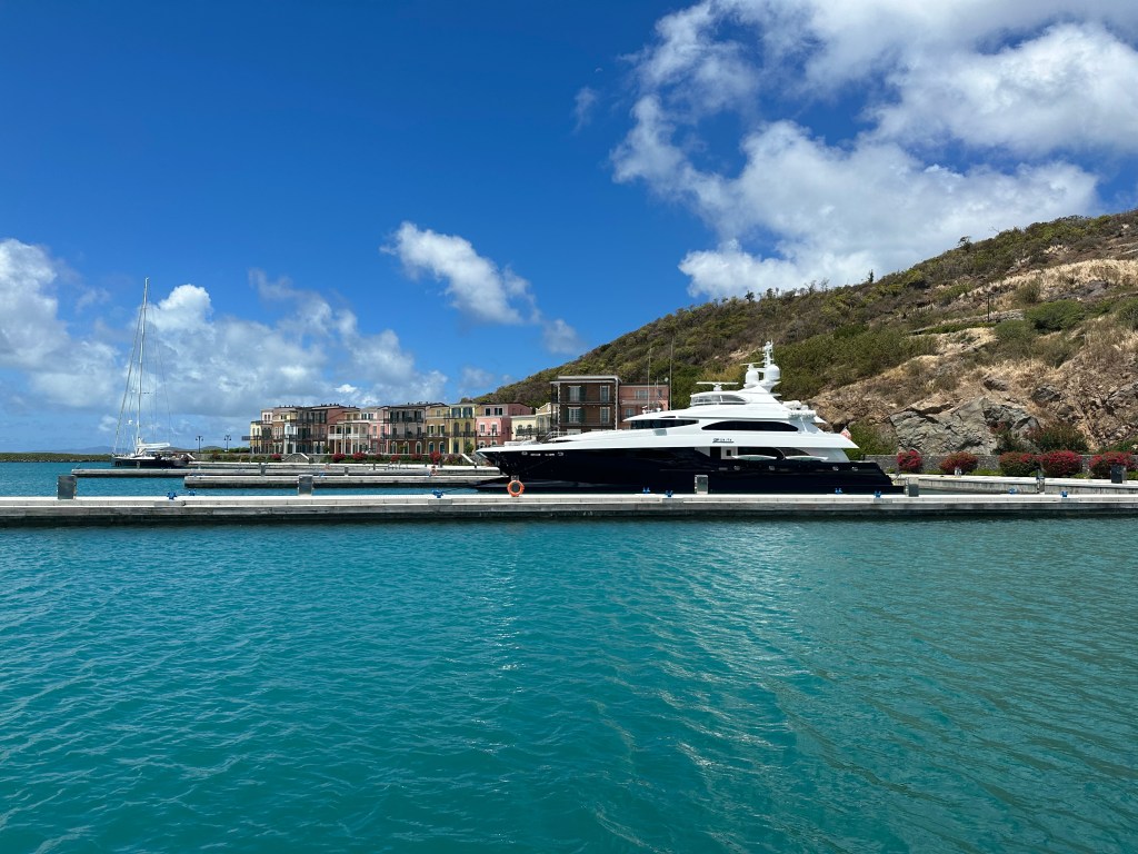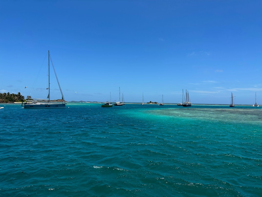 We enjoyed spending these few days with fellow sailors, moving at a slow pace and appreciating the beautiful surroundings. However, our boat was salt-encrusted, the fridge looked like an igloo, we had a lawn growing on the keel, and the batteries needed charging, so we said goodbye and headed up to the Sandy Lane Marina at the south end of Canouan to do some work on the boat. This end of the island is all new development, with a super yacht marina and an airport next door that is capable of taking business jets. There weren’t actually many super yachts around – we’ve been wondering all season where they are! However, apparently Jeff Bezos got off one early in the morning. Meanwhile, although the marina is beautifully designed and maintained, there was almost no one here. They are actually a bargain, and a welcome stop for a boat of our size, with a bakery, multiple beach bars and pools, and very attentive staff. I hope they flourish!