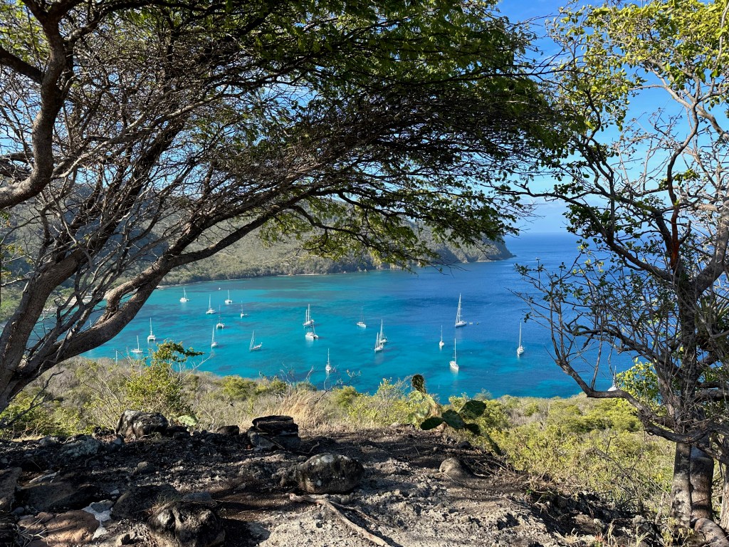 Leaving Carriacou, we went over to Clifton Harbour on Union Island to check back in to the Grenadines. This meant that poor Jeremy had to deal with Customs and Immigration for the fourth time in four days! We had been avoiding Clifton Harbour due to its sketchy reputation for unreliable moorings and scams; however someone guided us to a National Parks mooring and all was well. We didn’t stay long, heading instead for Chatham Bay, where some of our friends from the Salty Dawgs were anchored. We got together for hiking, happy hour and dinner at Susan’s Bar on shore. Susan also provided us with her own fresh-baked bread, ice, and a much-needed case of beer (provisioning error in Carriacou!!). The water was clear and fairly calm, and we enjoyed swimming and snorkeling.