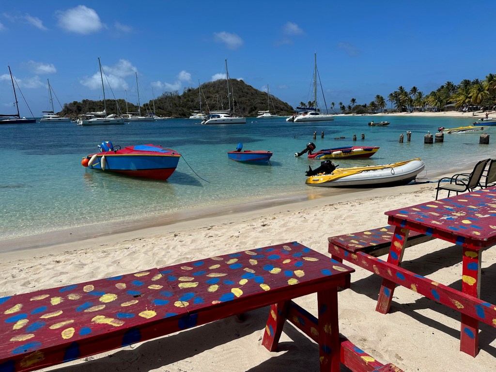 Overnight, the wind did indeed pick up. We had hoped to snorkel on the reef the next morning, but unfortunately it was too rough, so we moved round to Saltwhistle Bay. Our timing was great, as we were able to pick up the outermost mooring, which had just enough water for us to fit! We walked and swam on the beach in warm, clear water. We were “claimed” by boat guy Alex (he helped us with our mooring lines and then asked us if we wanted to have lunch at his bar; we felt we couldn’t say No!). Lunch was excellent but took rather a long time to arrive, as they ran out of propane half way through preparing it and had to send someone over to the main village to get more. Such is life in the southern Grenadines!