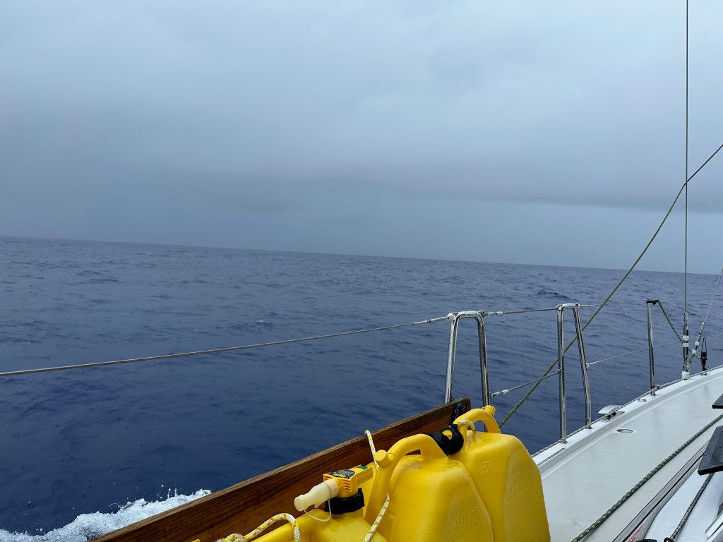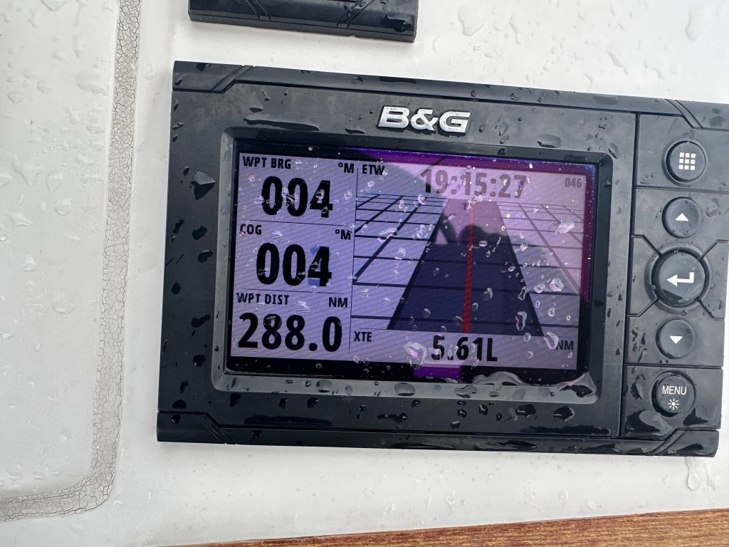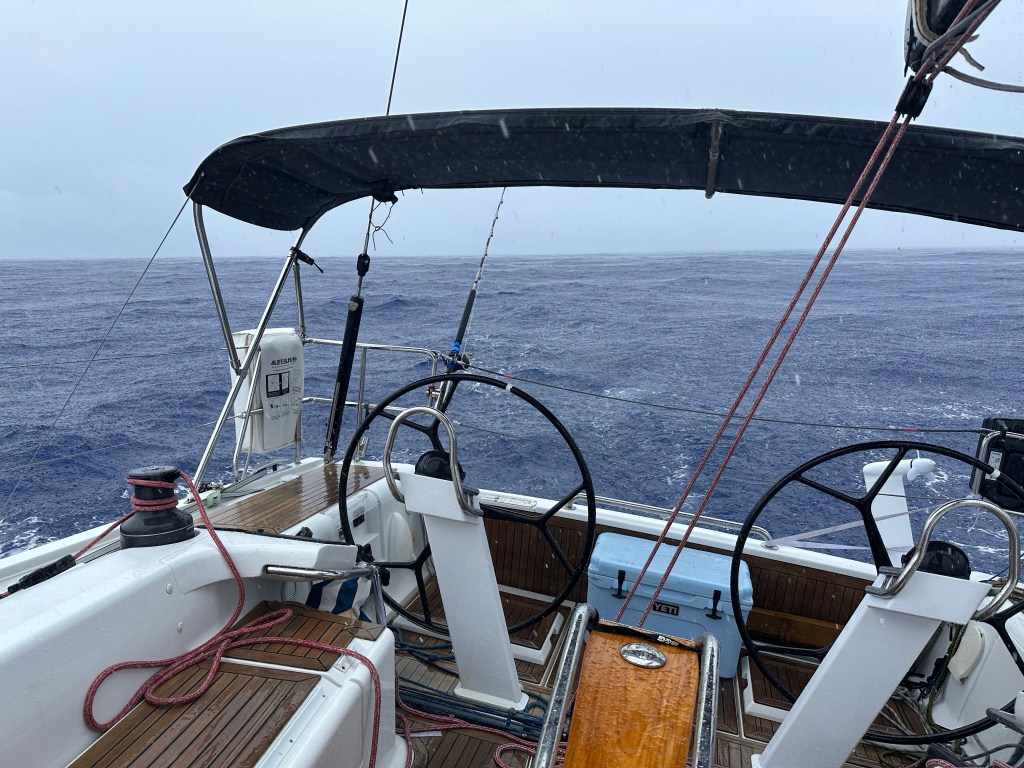 The weather has tormented us over the past 24 hours! Huge squalls appeared in the distance but never quite reached us. The wind built to a whopping 10 knots, so we hoisted sails, only to have it drop below 5 again almost immediately. We’ve spent much of the last day changing between sailing and motoring – sails in, out, up, down….. There are two sail boats within about 12 miles of us but we can only see them on AIS, not within eyesight. We expect as we get closer to Bermuda we will start to see more boats converging. It rained most of this morning so we sheltered down below, and Jeremy cooked us an excellent brunch! Everything down below is damp so we are looking forward to some fresher weather to dry things out, but all remain cheerful.