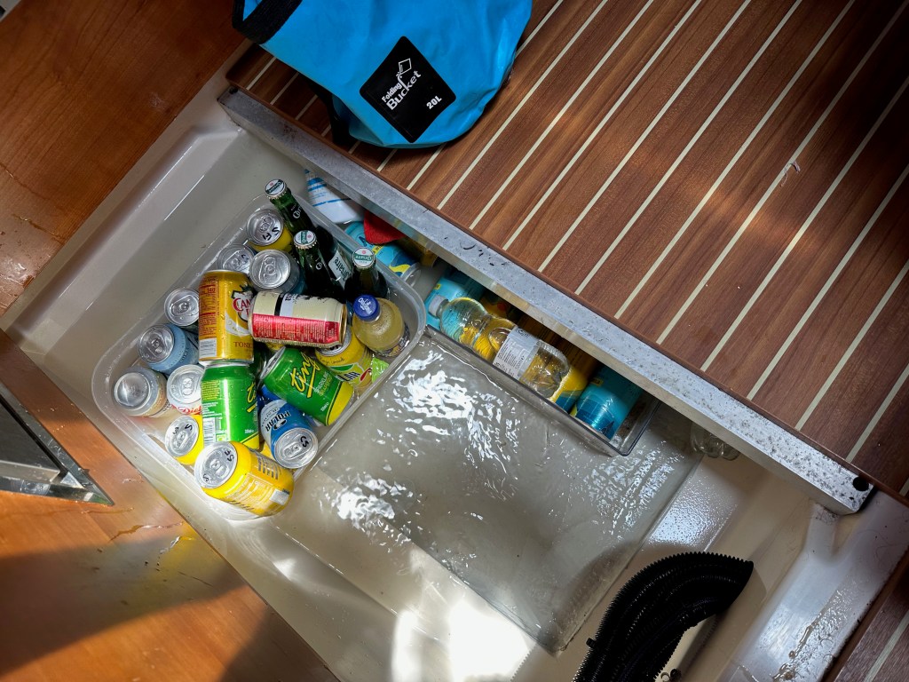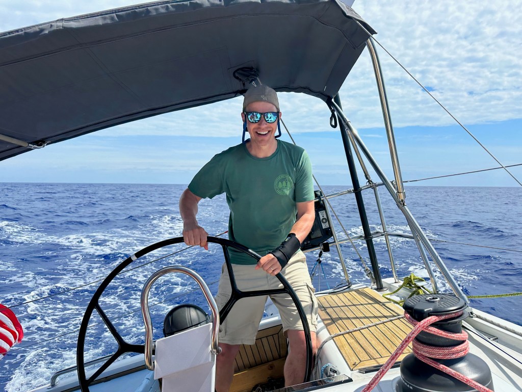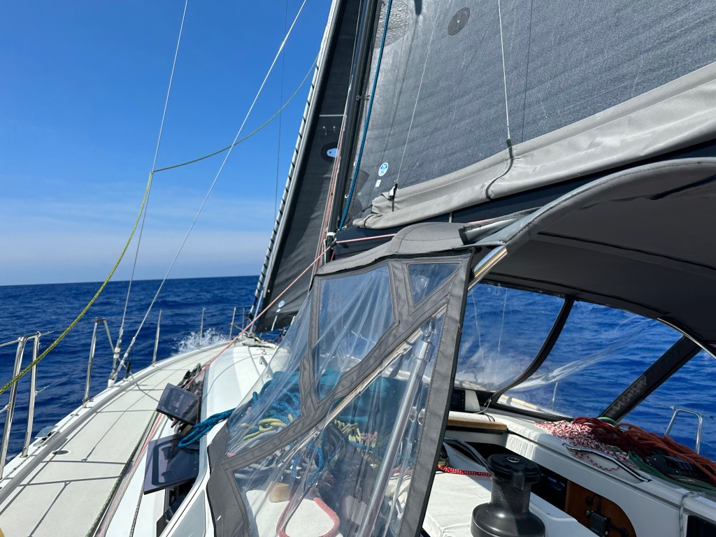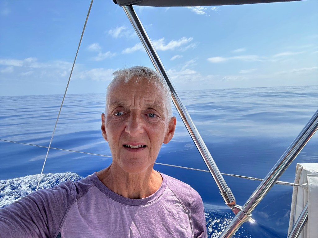 It poured with rain overnight, and the night watches were mostly spent sheltering down below. The morning started with flat calm. We could look down into the water and see fish swimming; we have also been seeing Portuguese Men of War drifting by – the Sargasso Sea is amazingly clear. Around noon there was enough wind to sail. As soon as we started to heel, we realized that the bilges were awash – yikes! It turned out that a fitting on the water maker had come loose, so that when we ran it for a few hours earlier today, some of the waste water ended up in the bottom of the boat. It took us over an hour to pull ships stores out, pump bilges, get everything more or less dry and stow it again. Fortunately the water doesn’t appear to have done any harm to the electronics on the boat. We are now sailing again and looking forward to being in Bermuda sometime tomorrow.