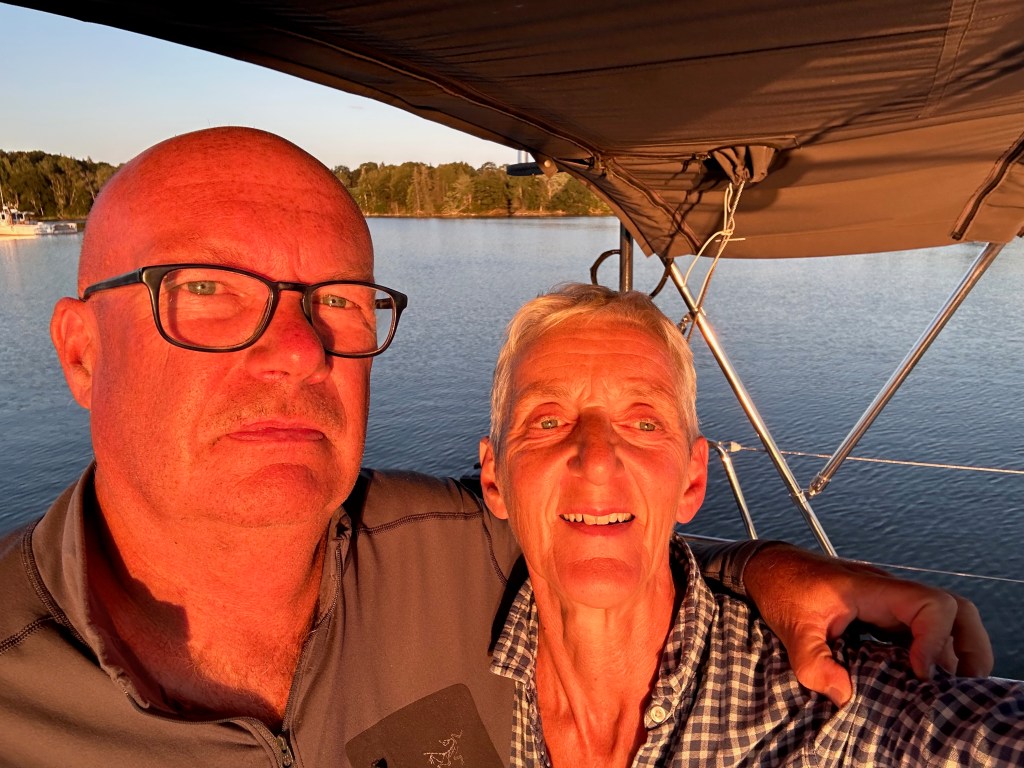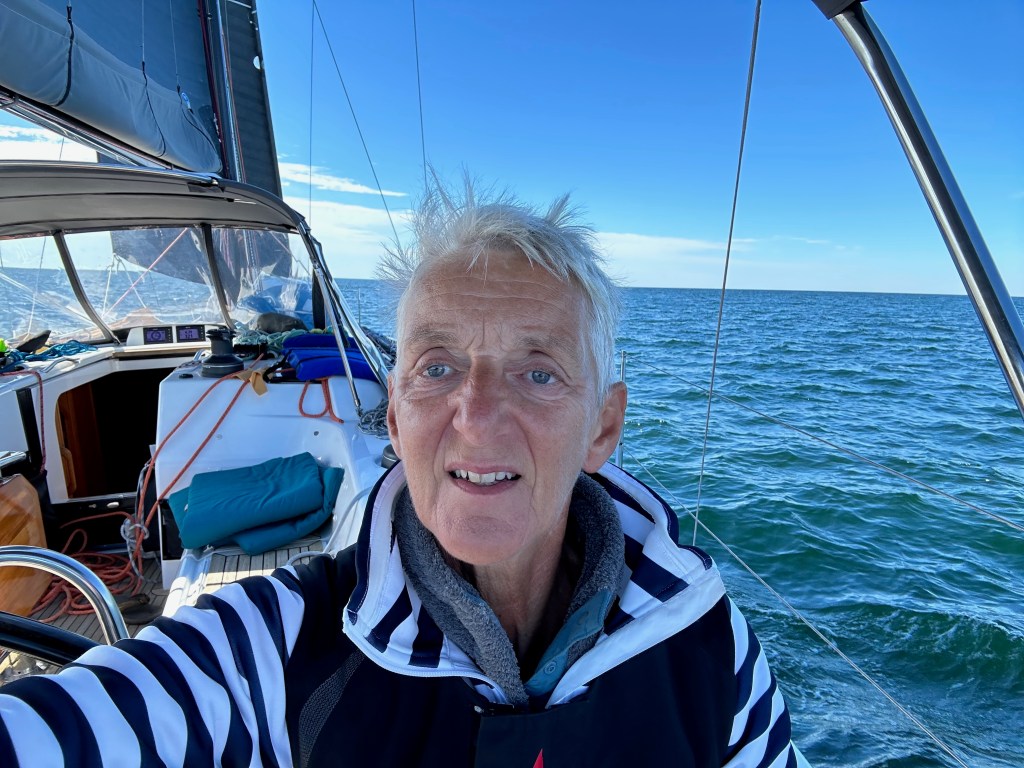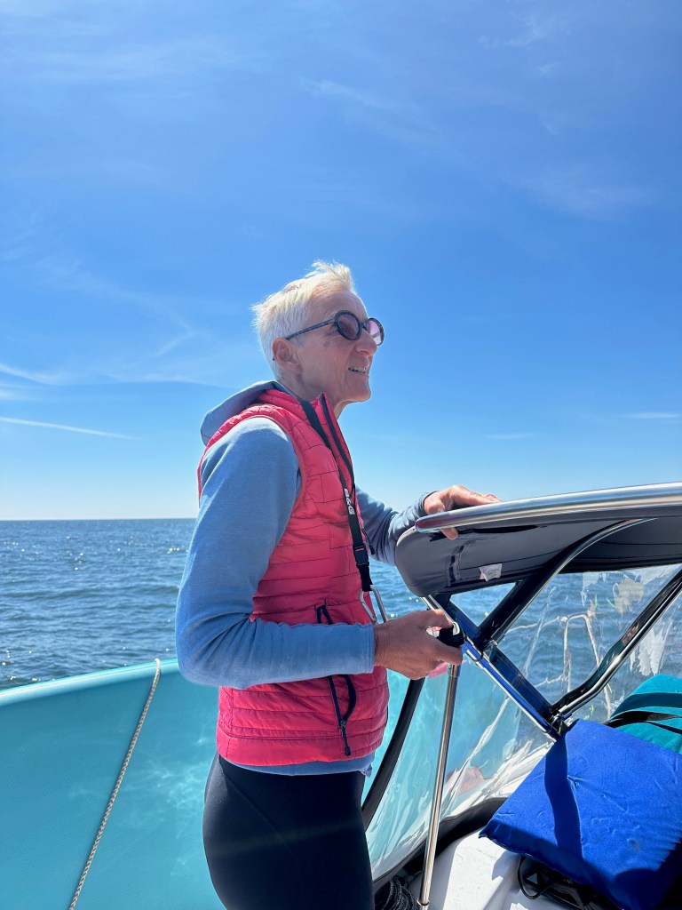 Our technique for steering through lobster pots – I peer over the spray dodger and steer using the remote for the auto-pilot, while Jeremy keeps an eye on navigation