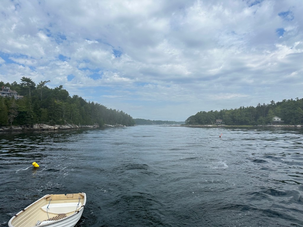 Exiting Little Sheepscot River. Notice the narrow gap behind us, and the current swirling past the lobster pot!