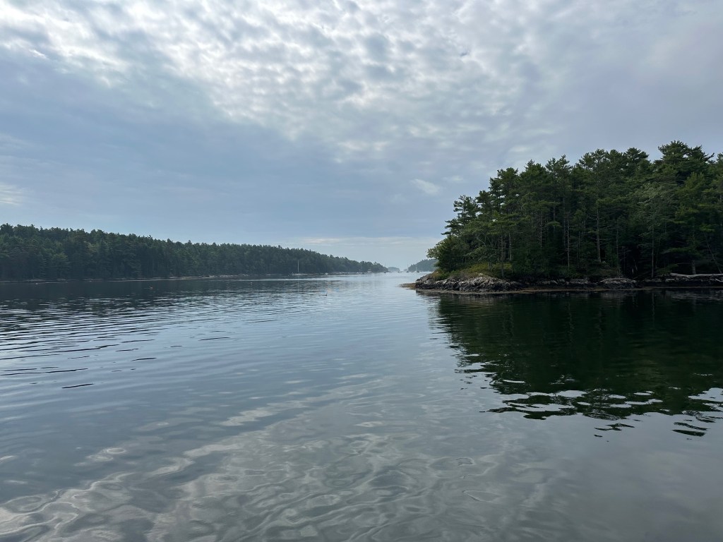 We had a long first day, but interesting, taking several of the classic Maine channels. We left Camp Island and headed through Deer Island Thoroughfare, with nice views of Stonington. From there we headed across East Penobscot Bay to Vinalhaven and through Fox Islands Thoroughfare (this was our 6th passage through there on this trip, we seem to have been doing a lot of back-tracking!). After that we headed over to Muscle Ridge Channel, and finally past Port Clyde and up the St George River into Maple Juice Cove. Lots of navigation, and lots of pots to avoid! We had a pleasant evening in Maple Juice Cove where it was noticeably warmer than we found further east, and we were happy to see eagles around.