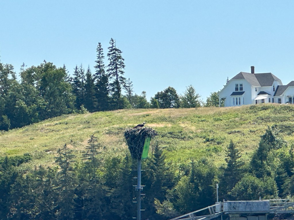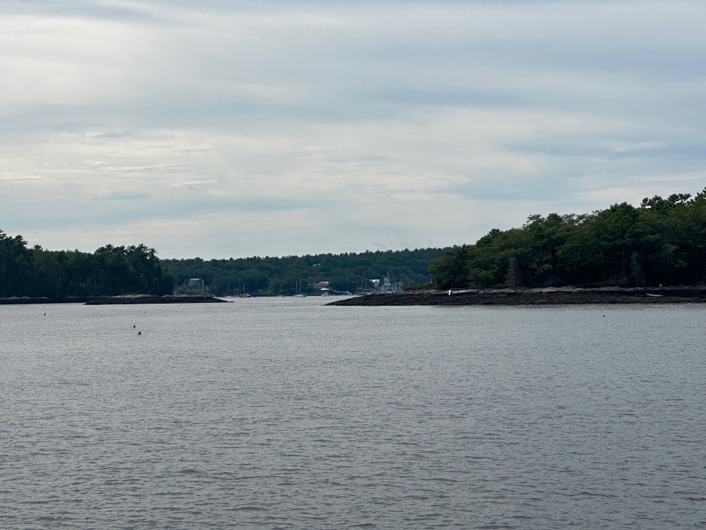I am intrigued by the numerous gunk holes and harbors in the rivers of mid-coast, so next day we headed for Sheepscot River, and into Robinhood Cove, which is about 8 miles up the river and entered through a fairly narrow channel. This is part of a complicated estuary for some of Maine’s largest rivers, with back channels and weird currents everywhere, and power boats were buzzing around, scaring themselves in the rapids at Hells Gates! Provisions were running low, so we had dinner ashore at the Osprey Restaurant. I can report that you can indeed see Ospreys from the restaurant! In the morning we left via Little Sheepscot River, which has a very narrow entrance through which the tide was rushing.