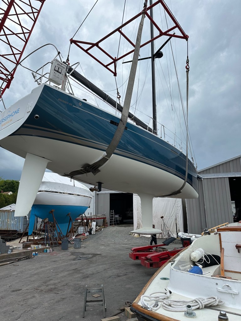 We were launched rather later than we’d hoped, but that’s nothing new. We had a new rudder and shaft built in carbon fiber, and new bearings. Then, in order for them to be installed things had to be moved around in the boatyard. Our winter storage fees are based on the square footage we occupy, but because our keel is so deep we always end up with two or three smaller boats wedged underneath (boatyard math)! Anyway, here we are in the slings – always a bit nerve-wracking: