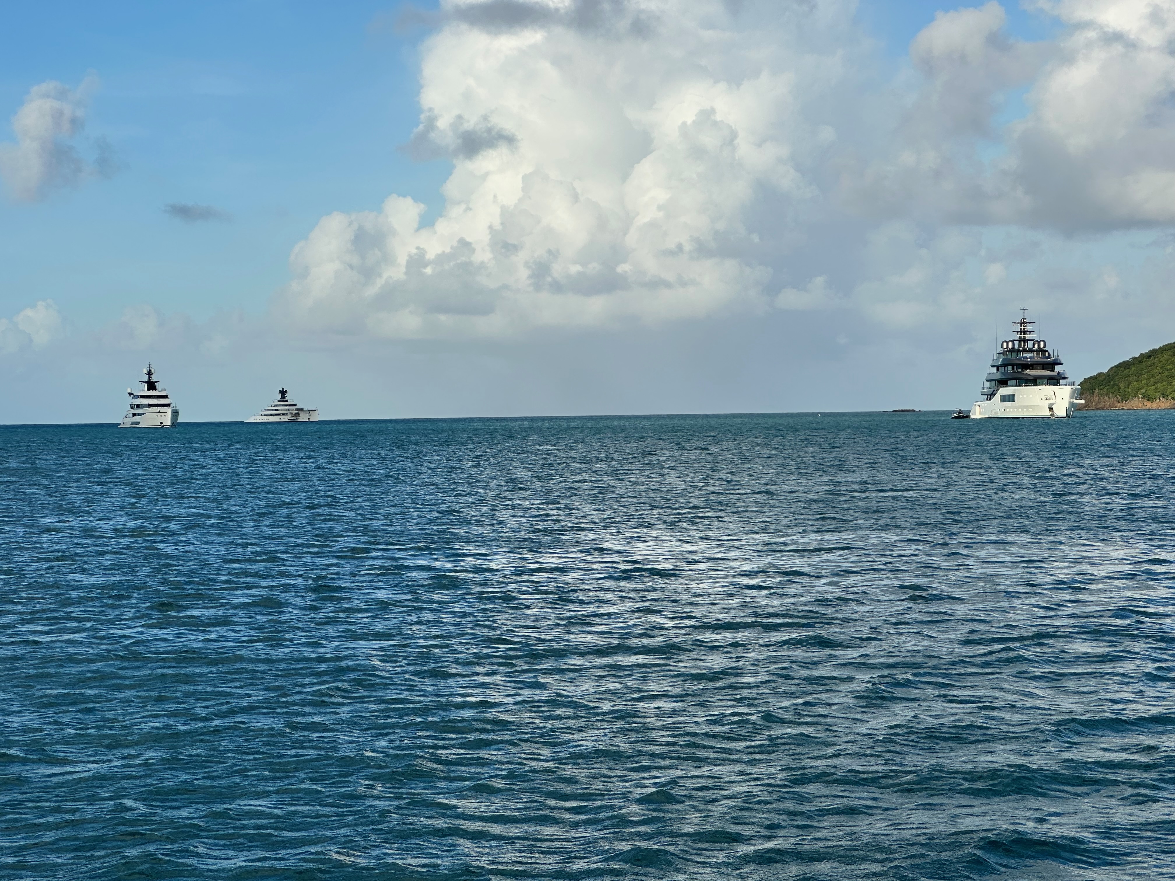 We visited Carlisle Bay, with lovely clear water and our first snorkeling of the trip. Then we moved to Five Islands Harbour and anchored behind Maiden Island. The super yacht fleet made an appearance – there were 5 of them there. The one at the back is called Pi, and is 100 meters long!