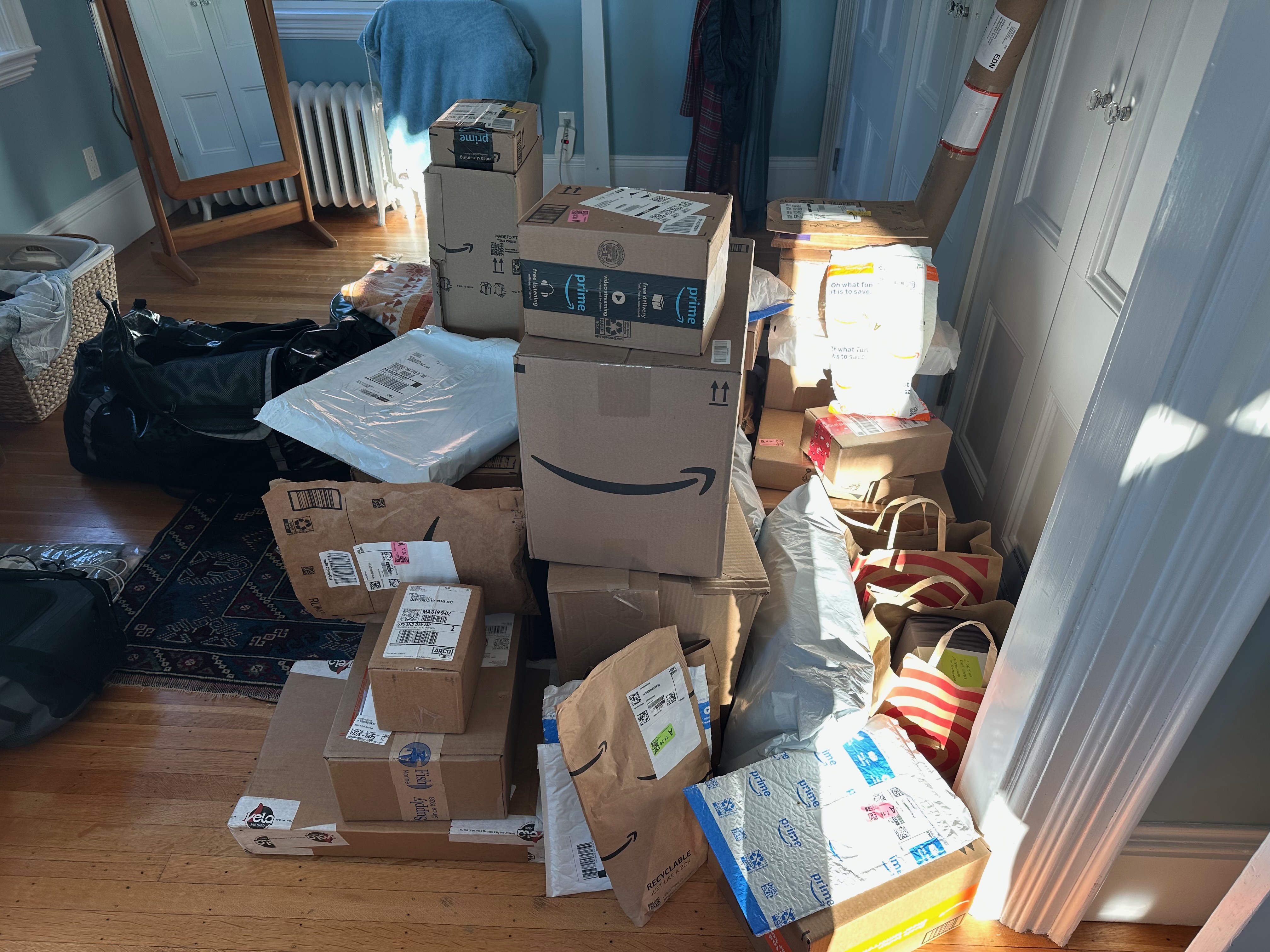 We had a scary-looking pile of boxes waiting for us at home. Fortunately all of that, plus a bit more, fit into four big bags to go back to Antigua. Even more fortunately, we’ve been able to find places for everything on our boat!
