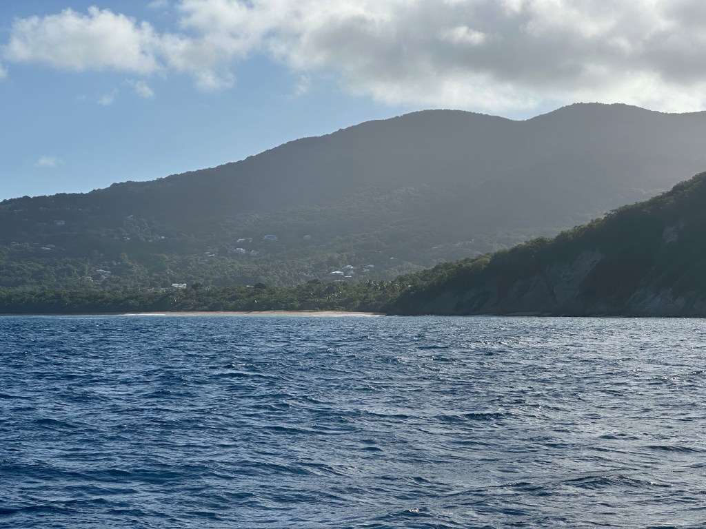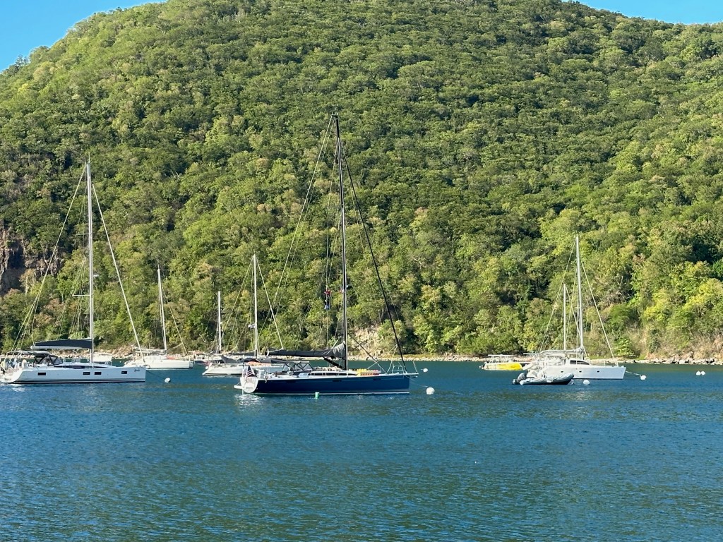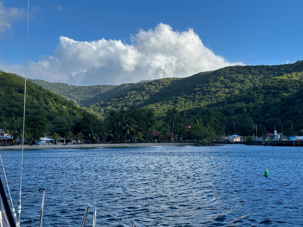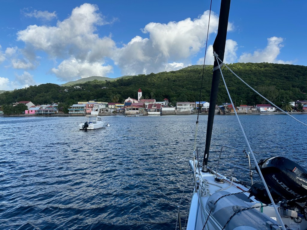 It’s amazing how a 6 hour sail can take you to not just a different country, but a different world! We sailed over to Guadeloupe in fairly bouncy conditions, hitting a few squalls along the way, and came into Deshaies (pronounced “Day-ay”) at the northern end of the island. We were delighted to see that the moorings there have been improved dramatically, and we were able to pick up one close to town. When we were here before the moorings were regarded as sketchy; however I dived on this one and found there was a hefty piece of chain attaching us to a cement block about 6 feet in diameter. Very reassuring! Interestingly, the block had a honey-comb structure around the outside and there were a lot of fish around it; I wondered whether they’ve been designed to provide habitat?