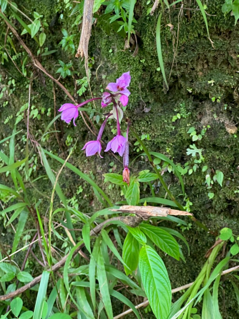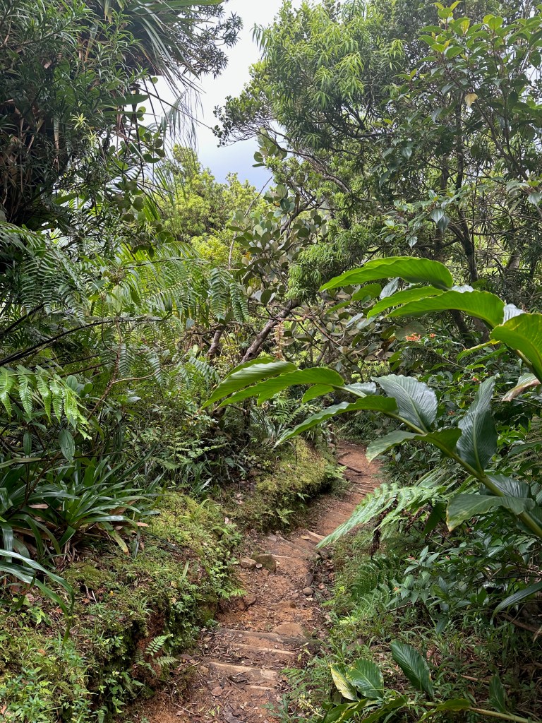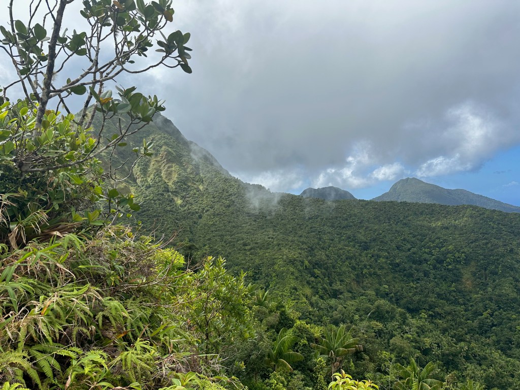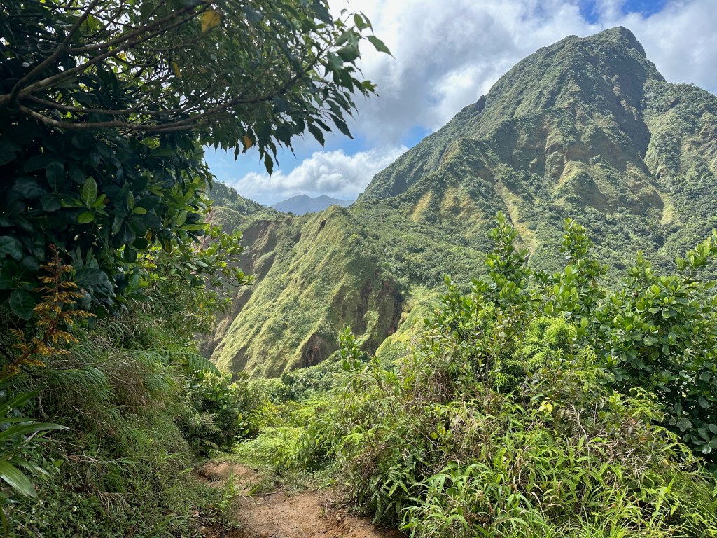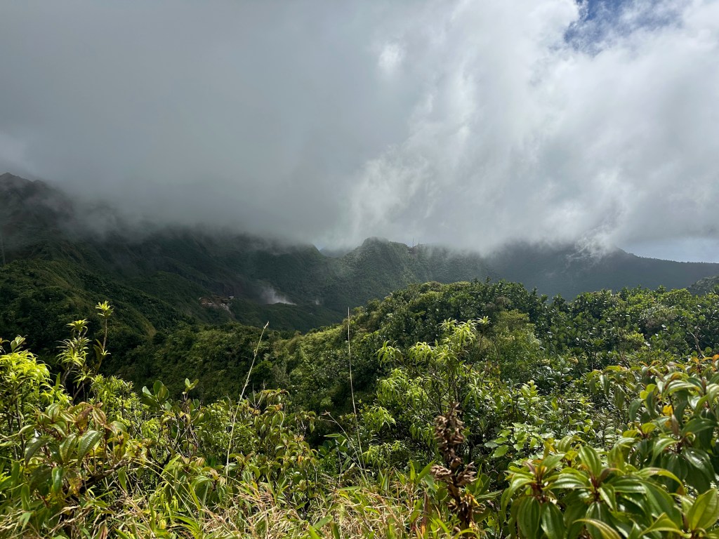 The park rangers keep the trail well maintained, and it didn’t seem too long before we reached the Breakfast River, where we filled our water bottles. Then the fun began! It was a steep climb of about 45 minutes to the top of Morne Nicholls, the highest point on the trail. We stopped for water and local fruit which Ninja had brought, and admired the spectacular views of nearby mountains, steam in the distance from the Boiling Lake, and work going on for the somewhat incongruous Cable Car that will one day whisk tourists up to the top.