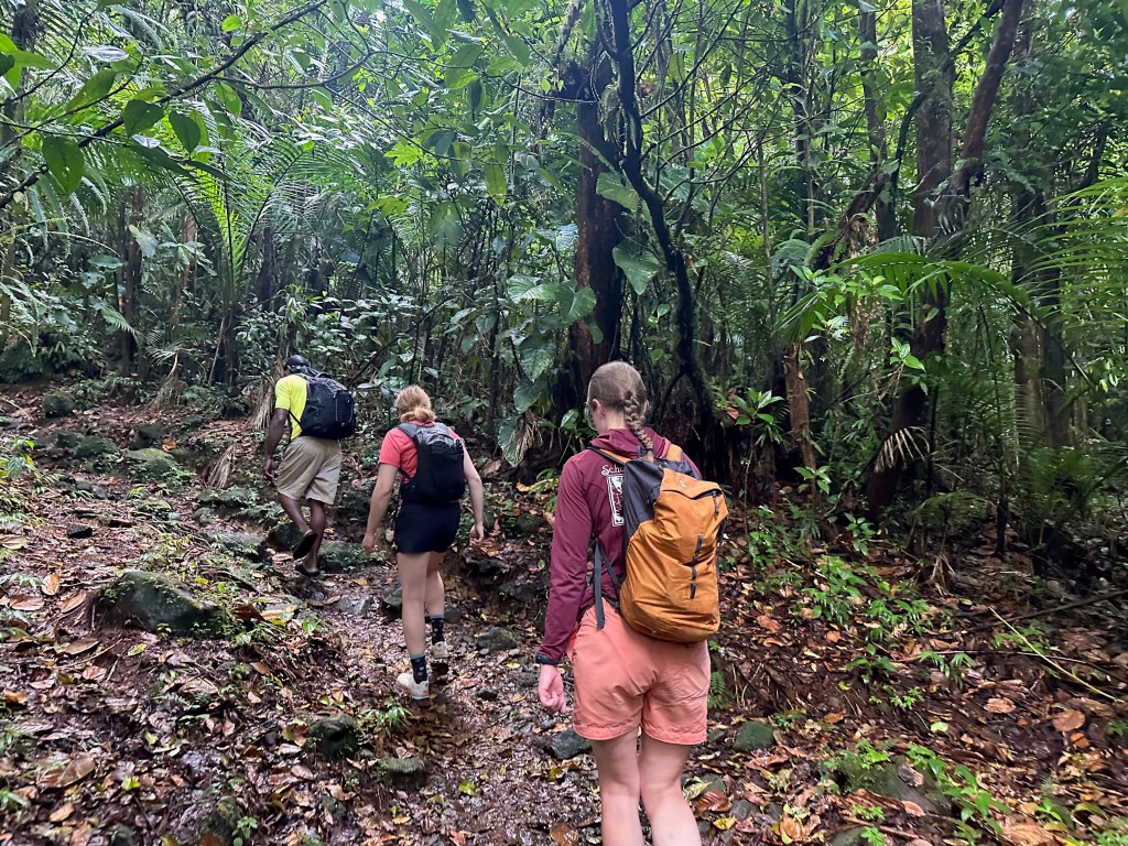 Our day started at 6:30 with a taxi ride from Portsmouth, where our boat was moored, to the other end of the island. After battling a little rush hour traffic in Roseau, we reached Titou Gorge, where the trail starts, and met our guide, Ninja. You must use a guide to do this hike, and Ninja was excellent. He started us off slowly, warning us that the hardest parts of the hike were later on, and as he stopped to show us native plants and talk about their uses for food, water and medicines, we worried that this was going to be more of a nature walk than a hike. We soon realized that he was just checking to see how out of breath we were (not at all!) and off we went. He is part Kalinago (indigenous people) and is very knowledgeable about the rain forest environment.