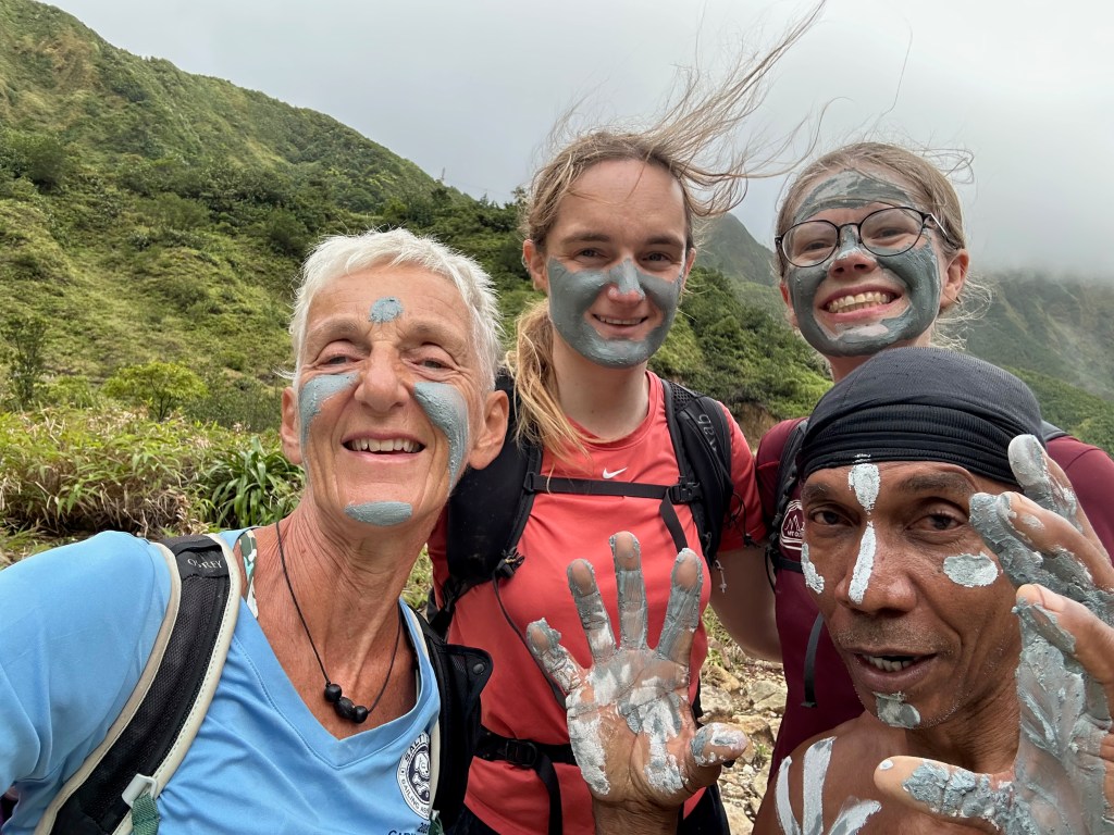 Next was a steep, muddy scramble down a stream bed. This washed out recently and the trail was impassable for a few weeks, but someone has worked hard to replace the stone and wooden steps. Eventually we reached Desolation Valley. Ninja suddenly sprinted ahead, leaving us to follow, and when we caught up we found him boiling eggs for us in one of the many hot springs bubbling up! He also painted us with warm mud from one of the pools. Desolation Valley is in fact an active volcanic crater, and is a disorienting mix of bare rock, hot springs, and patches of lush vegetation. The whole place smelled of sulphur and both Kyle and I realized later that we felt slightly giddy as we climbed out.