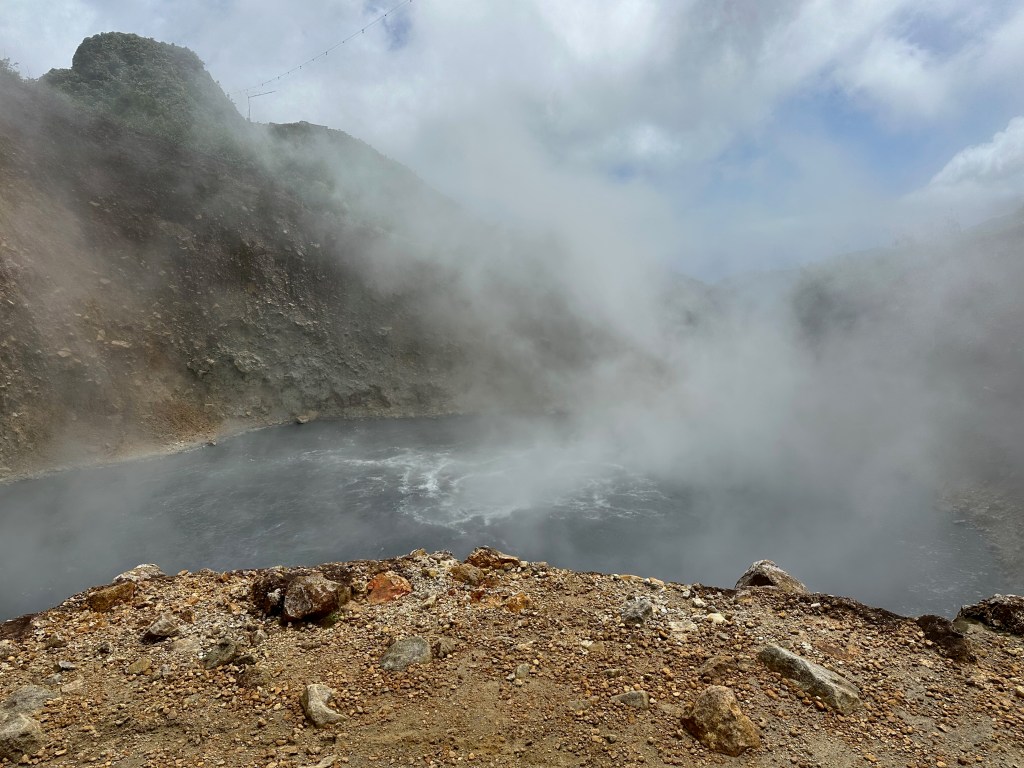 We finally hiked up to a natural platform which gave us a great view over Boiling Lake. Two natural springs drain into the crater, and gases coming from the magma chamber superheat ground water, which mixes with the spring water and brings it to a rolling boil. The view goes in and out as the steam billows around – some of those tourists in the cable car may not get the view they expected when they reach the top! We stopped for a delicious lunch of local fish, vegetables and fruit juice which Ninja had carried all the way up for us.
