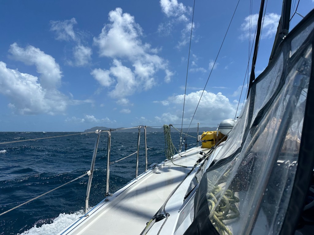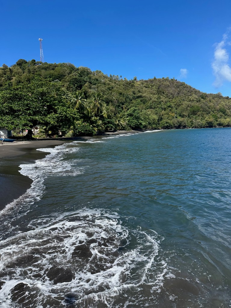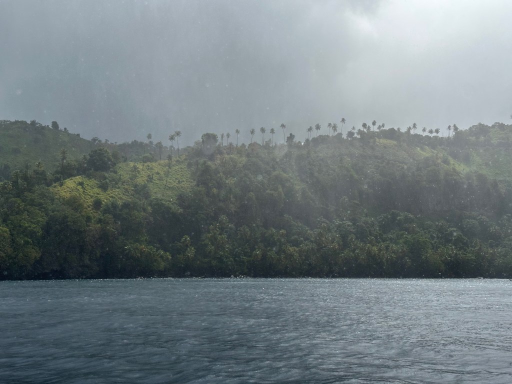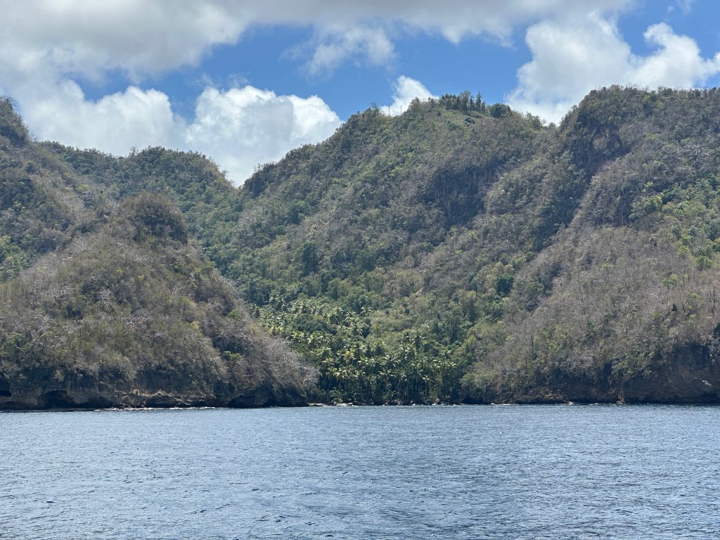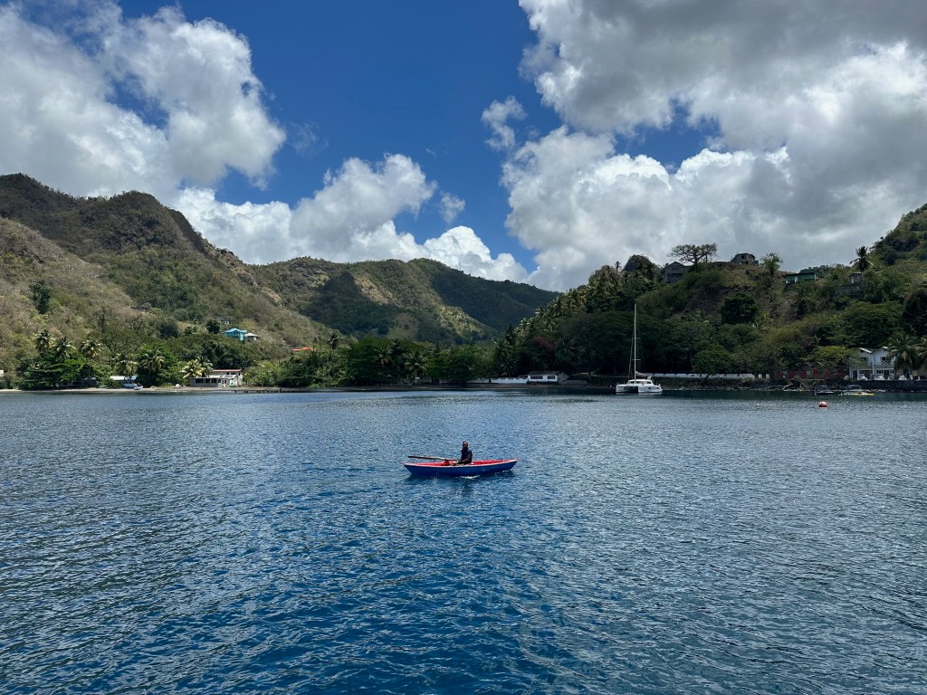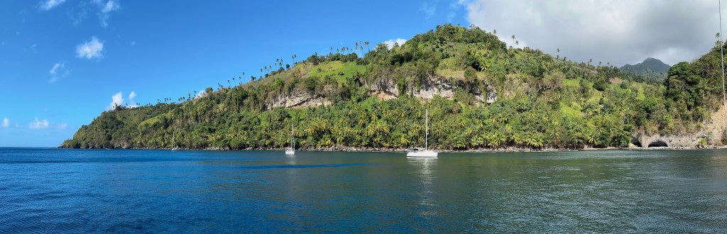 The next day was a fairly long passage down to St Vincent with strong winds and big seas. This is becoming repetitive! A huge high pressure system in the North Atlantic has resulted in about two months of very strong trade winds for the Eastern Caribbean. Many restaurants have no fish or other seafood as it’s been too rough for the fisherman to venture out. We wanted to try somewhere new, so came into Chateaubelair on St Vincent. We were swarmed by boys on paddle boards wanting to show us the best place to anchor, to take our trash, or just ask for food. Later we realized that, since it was Sunday afternoon, this counted as entertainment for them! Jeremy went ashore to clear in. The afternoon turned squally and wet, and so we hunkered down. When the sun did make an appearance we saw that we were in a stunning place, with palm trees on a ridge above us, terraced farms on impossibly steep slopes, and multiple layers of greenery everywhere.