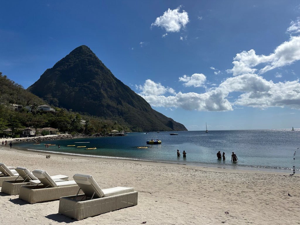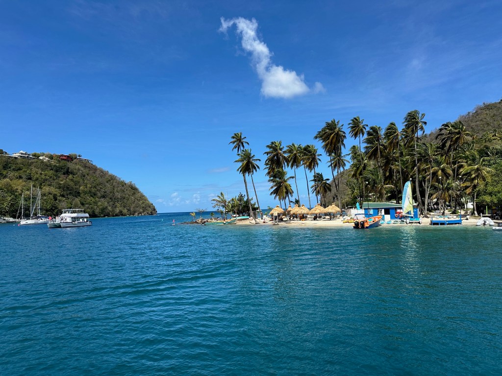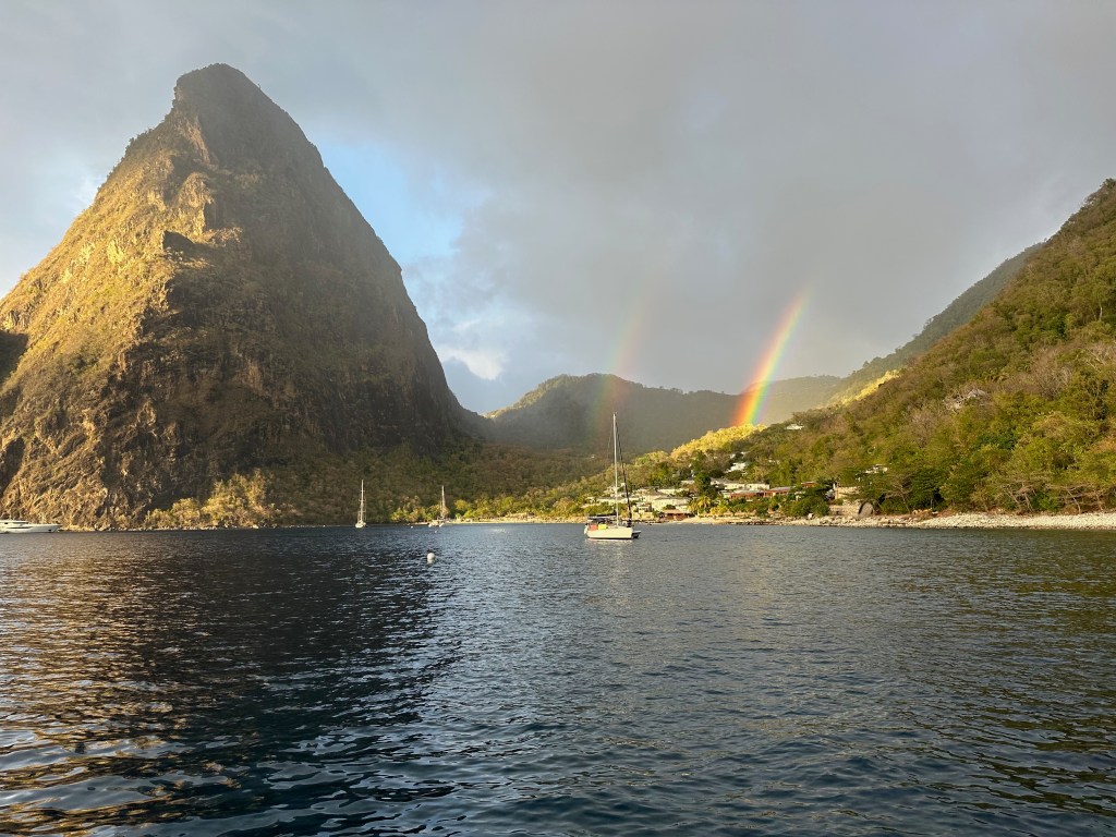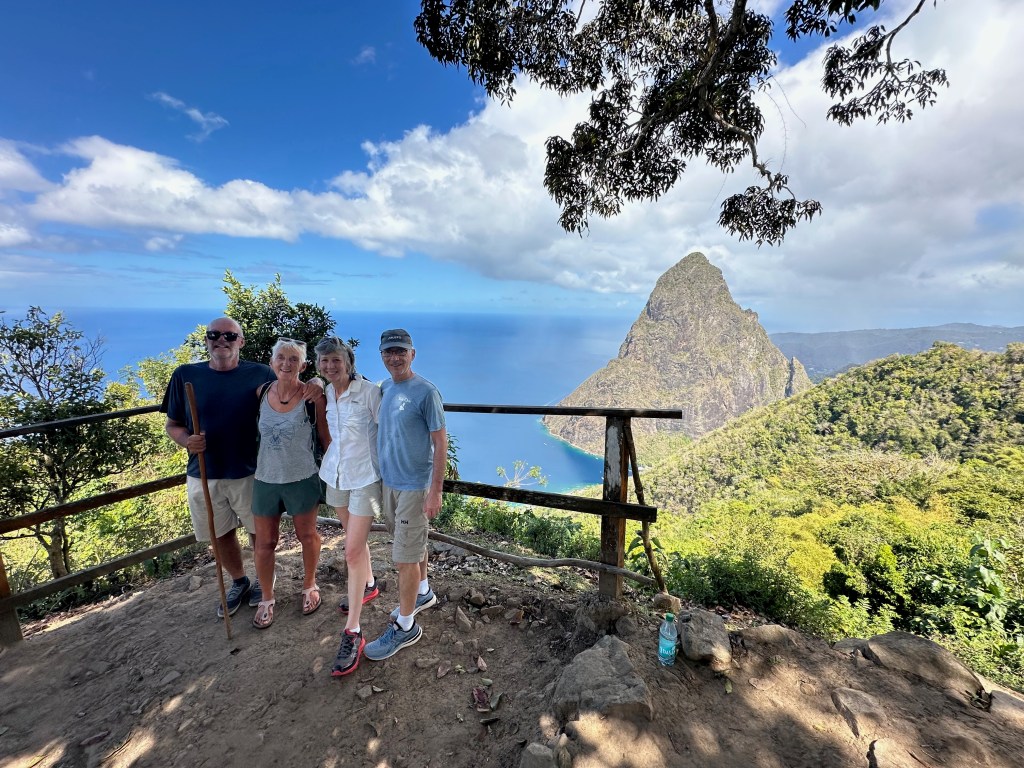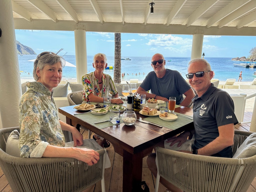 Our friends Sue and Denny joined us in St Lucia. We met sailing in the Caribbean 3 years ago and have sailed together several times since then. We spent the night in Marigot Bay and then sailed down to Sugar Beach, between the Pitons, then next day. Local guide Jahleel helped us pick up a National Parks mooring. We went ashore to have lunch at Sugar Beach Resort and then snorkeled along the cliffs. It was a lovely relaxed afternoon before a busy day!