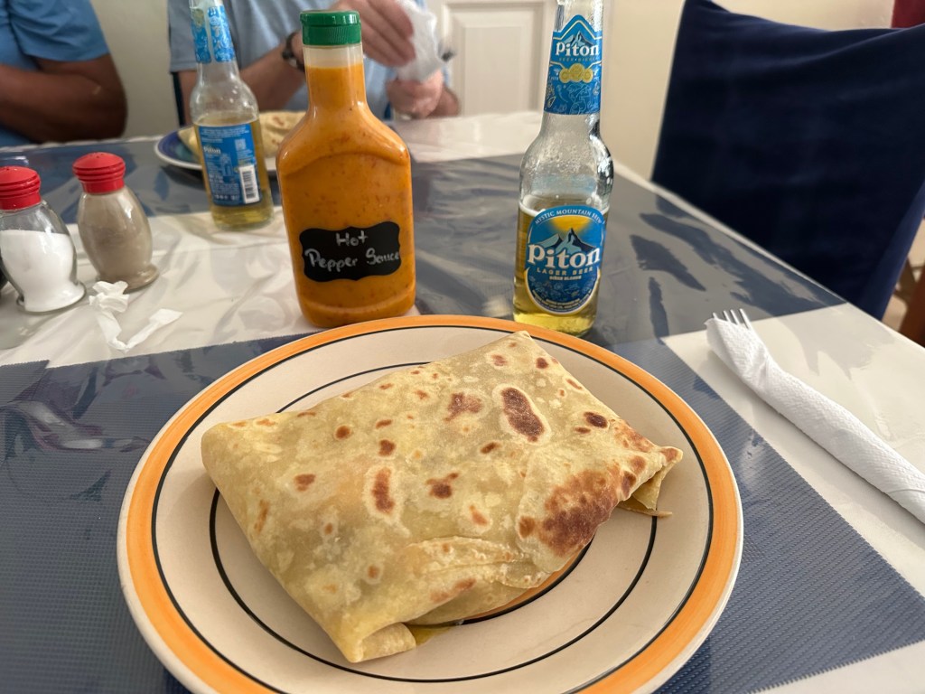 Our next stop was the Soufriere Botanic Garden where we admired huge Ginger Lily, Bird of Paradise and other native plants. Rain was moving in so we hustled through and headed for lunch – we had requested Roti, and Dave assured us he’d take us to the best Roti place in St Lucia. It was delicious! After a couple of quick errands we went back to the boat for the evening.